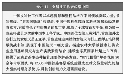 在科技创新中奋勇争先。实施科技创新巾帼行动,制定《关于支持女性科技人才在科技创新中发挥更大作用的若干措施》,提出支持女性科技人才承担国家科技计划项目、参与科技决策、完善女性科技人才评价激励机制等16项具体措施。国家自然科学基金青年科学家项目A、B、C类适当放宽女性申请人年龄限制,分别较男性申请人延长3年、2年、5年。依托中关村论坛、浦江创新论坛、世界人工智能大会等平台,设置科技女性峰会和论坛,持续举办巾帼工匠论坛、高层次女性科技人才研修班,为女性科技人才交流学习、成果转化、服务社会搭建平台。科技工作者中女性占比达到45.8%,她们在科技创新前沿阵地啃“硬骨头”,破“卡脖子”难题,潜心攻坚、勇攀高峰,为推进科技强国建设,加快实现高水平科技自立自强作出重要贡献。(见专栏11)