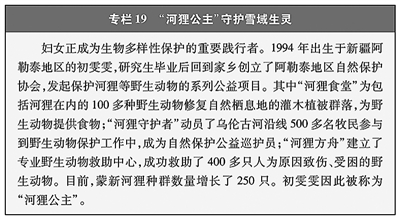 推动生态系统保护修复。统筹推进山水林田湖草沙一体化保护和系统治理,着力构建从山顶到海洋的保护治理大格局。广大妇女积极投身生态系统保护修复,在19.07万平方公里的三江源国家公园,有1.7万余名生态管护员日夜坚守,其中妇女占33.3%;海南昌江黎族自治县的“植树娘子军”,30余年持续摸索反复试验,在荒漠中种出了3万多亩近600万株海防林;陕西女子民兵治沙连50多年治理了1.4万亩荒漠地区,使昔日寸草不生、人迹罕至的荒漠变成了“林成网、树成行”的大漠绿洲;宁夏贺兰县“红马甲”巾帼志愿服务队常年开展护河护滩护鸟行动;江苏南京市持续开展“长江大保护”巾帼行动。在增绿护林、防沙治沙、江河保护、生物多样性保护等各方面都展现着妇女的坚韧与智慧。(见专栏19)