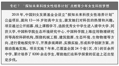 妇女科学素质逐步提升。颁布《全民科学素质行动规划纲要(2021—2035年)》,将提升妇女科学素质纳入其中。印发《中小学科学教育工作指南》,优化中小学课程教材、实验教学、师资培养、实践活动,加强科学教育资源对接转化。实施“科学有她——女生爱科学”“科技赋能女童”“春蕾科技女孩”“探知未来科技女性培养计划”“女性科学家成长计划”等公益项目,激发和培养女学生科学兴趣。实施女职工素质提升工程,帮助女职工提升数字技能。科学素质性别差距持续缩小,女性科技人才队伍规模逐步扩大、结构不断优化、能力显著提升,在基础理论、应用技术、工程实践等各个方面作出了杰出贡献。2024年,研究与试验发展(R&D)人员中妇女达284.6万,比2012年增加169.2万。(见专栏7)