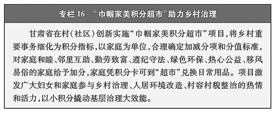 积极发挥家庭家教家风建设在基层治理中的作用。健全家庭文明建设、家校社协同育人、家庭服务有效供给、婚姻家庭矛盾纠纷化解等机制,为妇女引领家庭成员共建共享平安和谐社会提供保障。深化家庭文明建设,开展寻找“最美家庭”活动,持续创建文明家庭、评选五好家庭,开展“家规家训亮家风”“家书家信传家风”“科学家教育家风”等培育好家风系列活动,大力弘扬爱国爱家、相亲相爱、向上向善、共建共享的社会主义家庭文明新风尚。累计创建全国文明家庭1597户,评选全国五好家庭6258户,涌现出各类“最美家庭”1648万户,组织家教家风巡讲展演活动50多万场,覆盖2.5亿人次。(见专栏16)