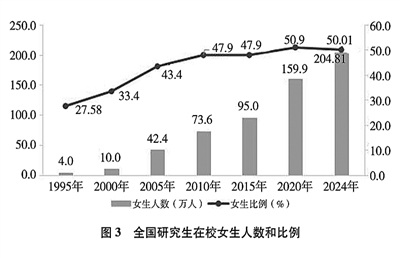 高等教育男女比例基本均衡。持续推进建设全球规模最大的高等教育体系,巩固提升高等教育普及化水平,以政策规定保障普通高等学校招生性别公平。2024年高等教育在校生中女生占50.76%,比1995年提高14.15个百分点。其中,女研究生占50.01%,比1995年提高22.43个百分点。(见图3)