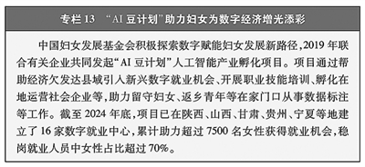 在数字经济中绽放光彩。颁布提升全民数字素养与技能行动纲要、数字乡村发展行动计划,提出开展妇女数字素养教育与技能培训、发展巾帼电商品牌等措施。广大妇女适应数字时代要求,踊跃投身数字经济发展。2024年,共有14147名妇女取得人工智能训练师职业技能等级证书,占42.3%。互联网领域创业者中妇女超过一半。数字贸易、电商、直播等新业态就业者中妇女约占三分之一,数字经济性别红利不断释放。(见专栏13)