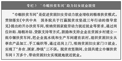 发展生产助力妇女就业增收。坚持开发式扶贫方针,赋能贫困妇女发展。加强产业扶持,推进食品加工、服装制造等劳动密集型产业梯度转移,产业帮扶政策覆盖98.9%的贫困户,通过东西部劳务协作、建立扶贫车间、开发乡村公益性岗位等,为有劳动能力和意愿的贫困妇女提供工作机会;鼓励支持电商扶贫、光伏扶贫、旅游扶贫等新业态新产业发展,帮助贫困妇女实现家门口就业;发展民族地区手工编织产业,让“苗绣”“彝绣”等订单式手工编织从“指尖技艺”转化为“指尖经济”。加强财政和金融支持,脱贫攻坚期间,出台专门政策提供免抵押免担保的贴息贷款、税费减免等支持,累计为妇女发放小额担保贷款和扶贫小额信贷4500多亿元,870万名妇女实现创业增收;2021—2024年,192.8万名妇女持续获得脱贫人口小额信贷768.3亿元。加强能力培训,开展多渠道、多层次、多形式的职业技能培训、创业培训和农业实用技术培训,截至2020年,累计对1021万名贫困妇女和妇女骨干进行各类技能培训;2023—2024年,“雨露计划”共资助63.2万名妇女接受职业教育,妇女发展内生动力持续激发。(见专栏3)