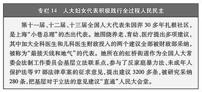 通过人民代表大会行使国家权力。人大代表中妇女代表比例不断提升。2023年第十四届全国人大妇女代表790人,占26.5%,比第十二届、十三届分别提高3.1个、1.6个百分点;全国县、乡两级人大妇女代表比例分别为31.64%、32.36%。人大妇女代表依法履职尽责,听取和反映妇女群众和各方意见建议。2018—2025年,全国人大妇女代表提出建议、批评和意见共29328件,占建议总数的42.3%。(见专栏14)