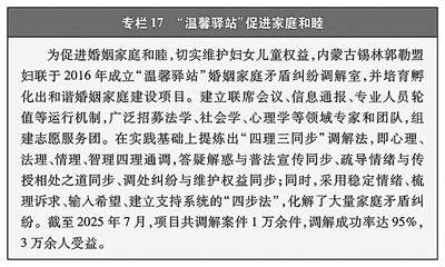 广泛参与平安和谐社区建设。妇女积极参与社会治安综合治理,助力将矛盾纠纷化解在基层。各地积极探索“妇联+”调解模式,截至2024年底,妇联牵头建立3690个县以上婚姻家庭纠纷人民调解委员会,推动婚调组织入驻综治中心、诉讼服务中心、社区警务室,并在村(社区)建设婚调工作室,2016年以来调解近136万件案件。2023年,司法部表彰的999名全国模范人民调解员中女性为295人,占29.5%。妇女积极参与治安巡逻和督导检查,江苏镇江京口区的“江东大妈”工作队自2017年成立以来,累计参与义务巡逻5000小时,参加各类公益活动1000余次;北京市的“西城大妈”、陕西渭南市的“巾帼民情员”等及时发现和报告社会治理隐患,成为化解基层矛盾的前哨。广大妇女活跃在社区工作者、网格员、楼栋长群体中,为建设平安和谐社区发挥重要作用。(见专栏17)