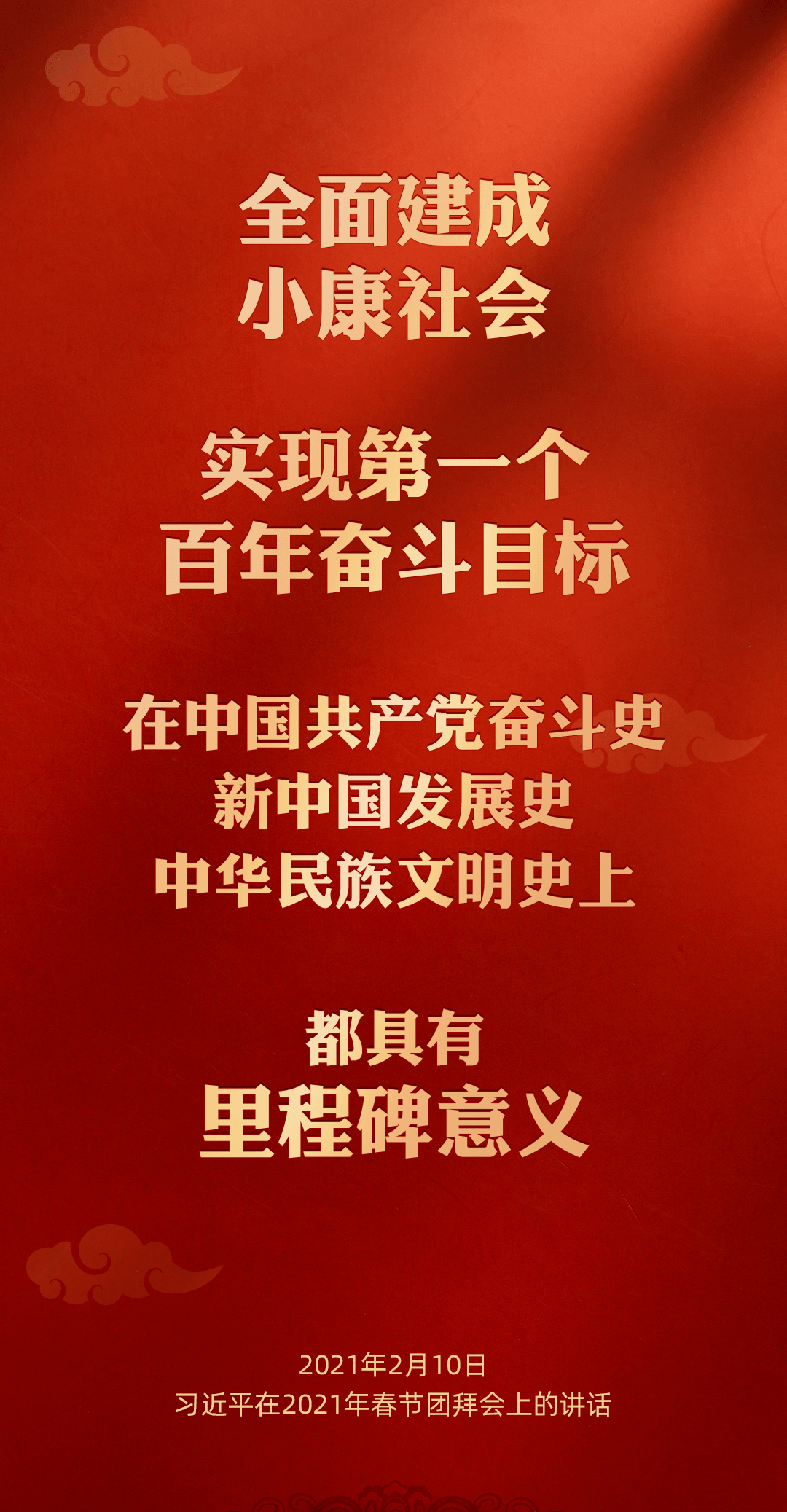 全面建成小康社会,实现第一个百年奋斗目标,在中国共产党奋斗史、新中国发展史、中华民族文明史上都具有里程碑意义。同时,我们必须认识到,这只是我们迈向中华民族伟大复兴的关键一步,我们决不能骄傲自满、止步不前,要继续谦虚谨慎、戒骄戒躁,继续艰苦奋斗、锐意进取,为实现第二个百年奋斗目标、实现中华民族伟大复兴而奋力拼搏,为人类和平与发展的崇高事业不断作出新的更大贡献!