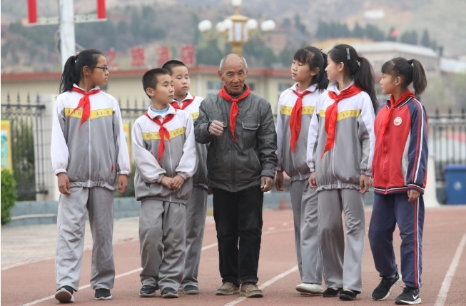 闫青海(中)给孩子们讲奋斗创业的故事(2019年4月8日摄)。新华社发