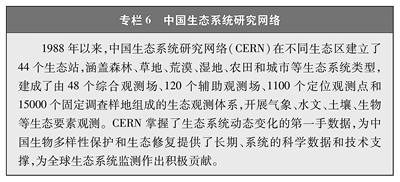完善监测观测网络。中国建立起各类生态系统、物种的监测观测网络,在生物多样性理论研究、技术示范与推广以及物种与生境保护方面发挥了重要作用,为科研、教育、科普、生产等各领域提供了多样化的信息服务与决策支持。其中,中国生态系统研究网络(CERN)、国家陆地生态系统定位观测研究网络(CTERN)涵盖所有生态系统和要素,中国生物多样性监测与研究网络(Sino BON)覆盖动物、植物、微生物等多种生物类群,中国生物多样性观测网络(China BON)构建了覆盖全国的指示物种类群观测样区。