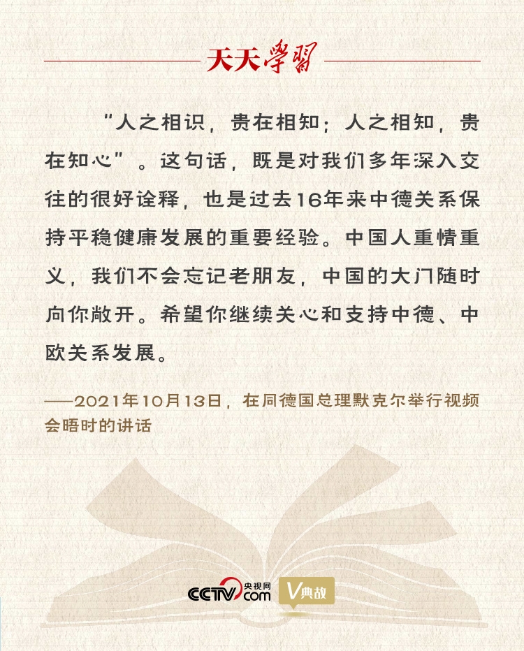 天天学习10月13日,习近平主席同德国总理默克尔举行视频会晤。双方在友好的氛围中回顾近年中德、中欧关系发展并就相关问题深入交换意见。习主席积极评价默克尔任内为推动中德、中欧关系发展所作的贡献,并引用“人之相识,贵在相知;人之相知,贵在知心”,称这句话“既是对我们多年深入交往的很好诠释,也是过去16年来中德关系保持平稳健康发展的重要经验”。