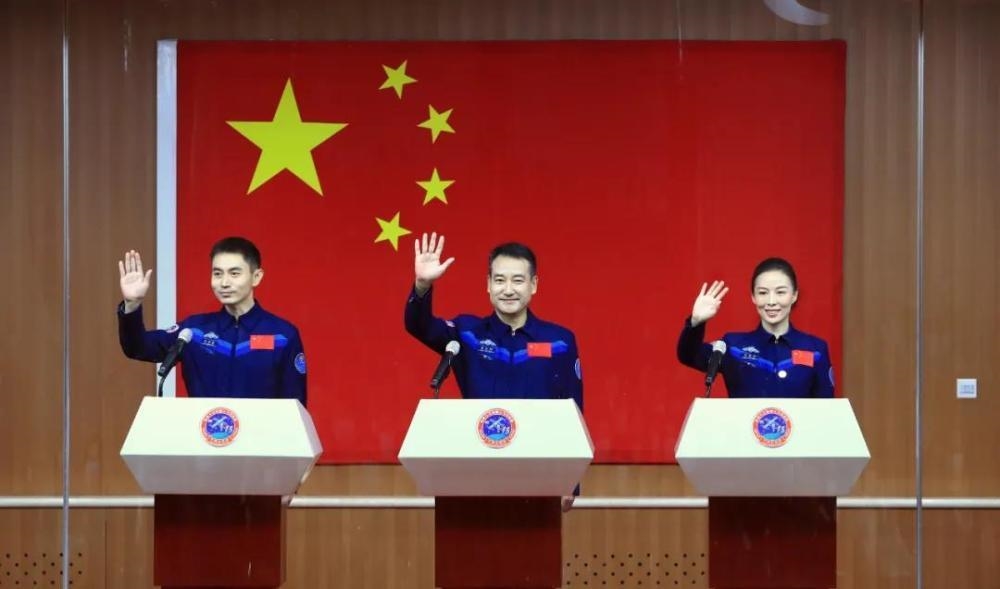 ▲ 10月14日,执行神舟十三号载人飞行任务的3名乘组航天员翟志刚(中)、王亚平(右)、叶光富在酒泉卫星发射中心问天阁与中外媒体记者集体见面,并回答记者提问。琚振华摄/ 本刊