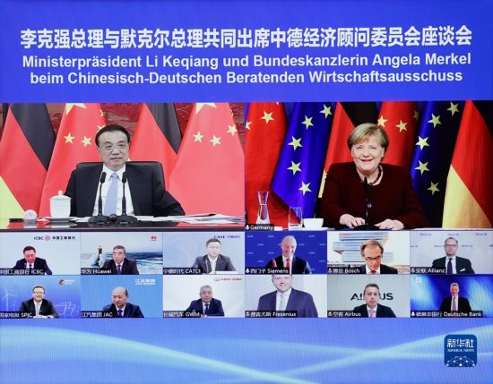 10月18日,国务院总理李克强在北京中南海紫光阁与德国总理默克尔以视频方式共同出席中德经济顾问委员会座谈会,并同与会代表交流。 新华社记者 刘彬 摄