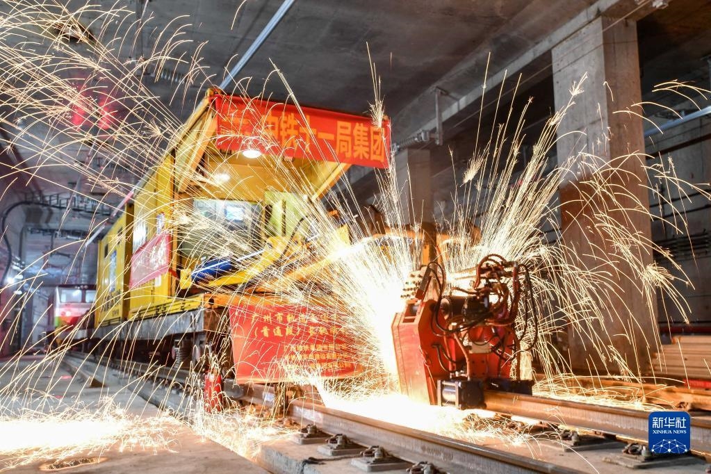 中铁十一局轨道焊机在焊接广州地铁18号线首通段最后一个钢轨接头(4月20日摄)。新华社记者 刘大伟 摄