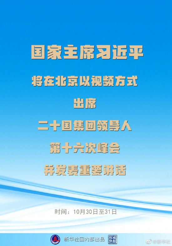 权威快报丨习近平将出席二十国集团领导人第十六次峰会 来源:人民网 发布时间:2021-10-29 10:00:51 浏览次数: 次 【字体:小 大】 原标题:权威快报丨习近平将出席二十国集团领导人第十六次峰会 外交部发言人华春莹29日宣布:应意大利共和国总理德拉吉邀请,国家主席习近平将在北京以视频方式出席10月30日至31日举行的二十国集团领导人第十六次峰会并发表重要讲话。 来源: 人民网 分享到: 关闭本页 【打印正文】