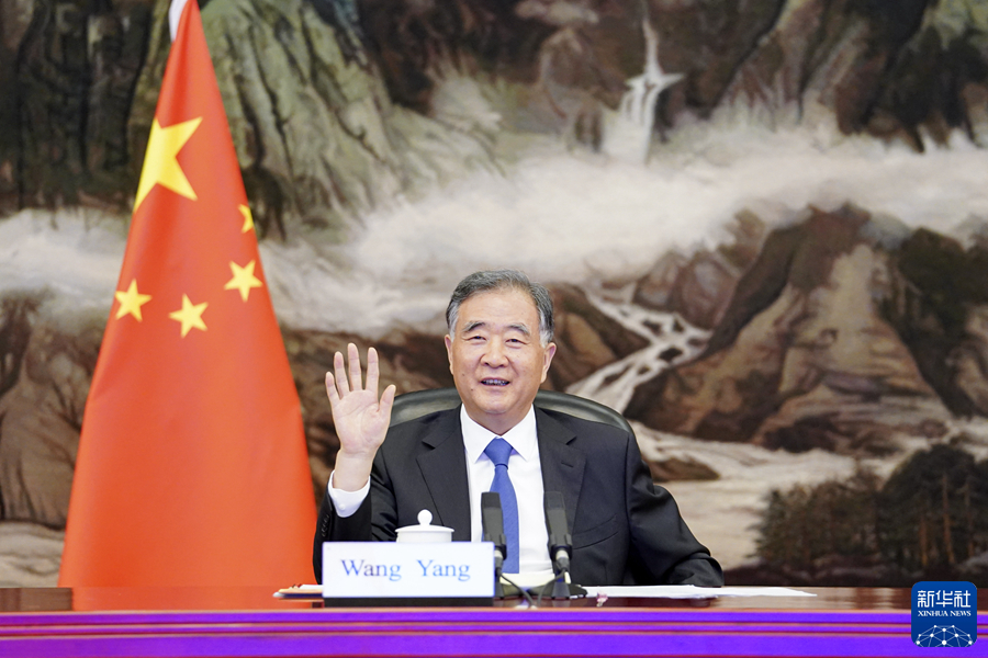 11月1日,全国政协主席汪洋在北京以视频方式会见泰国国会副主席兼上议院议长蓬佩。新华社记者 殷博古 摄