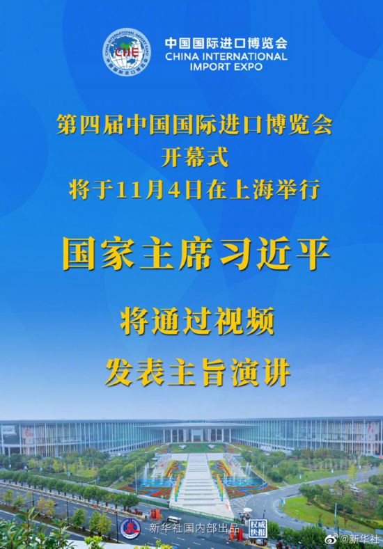 国家主席习近平将在第四届中国国际进口博览会开幕式上通过视频发表主旨演讲 来源:人民网 发布时间:2021-11-03 10:00:14 浏览次数: 次 【字体:小 大】 新华社北京11月3日电 商务部新闻发言人高峰3日宣布:第四届中国国际进口博览会暨虹桥国际经济论坛开幕式将于11月4日在上海举行。国家主席习近平将通过视频发表主旨演讲。 来源: 人民网 分享到: 关闭本页 【打印正文】