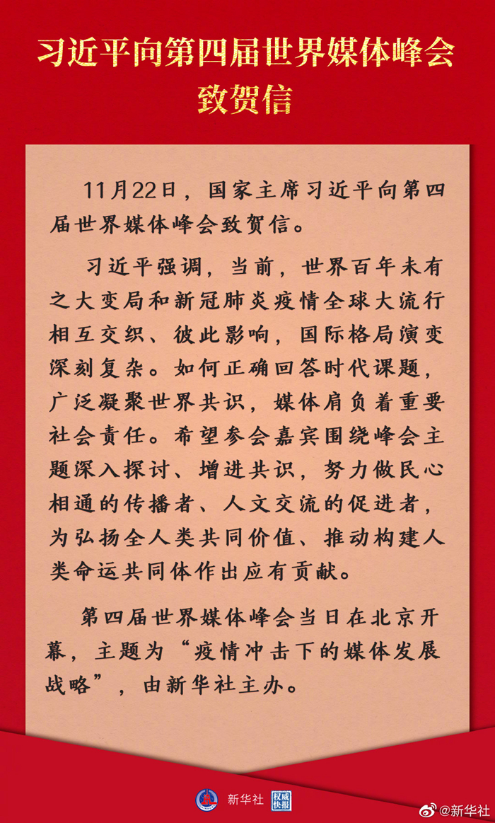 新华社北京11月22日电 11月22日,国家主席习近平向第四届世界媒体峰会致贺信。