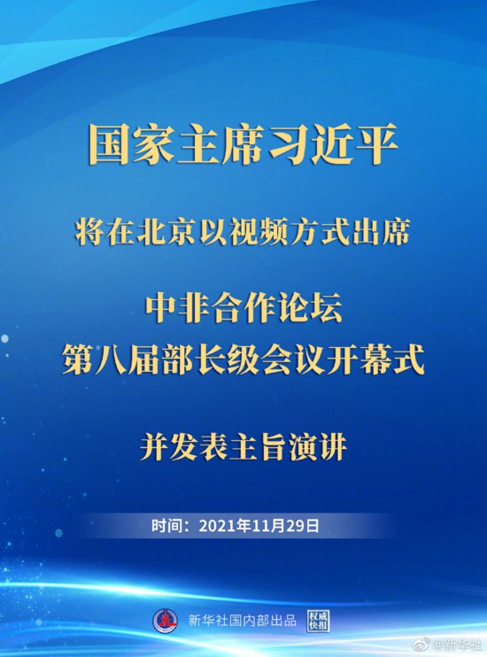 权威快报丨习近平将出席中非合作论坛第八届部长级会议开幕式 来源:人民网 发布时间:2021-11-26 10:00:14 浏览次数: 次 【字体:小 大】 外交部发言人华春莹11月26日宣布:国家主席习近平将于11月29日在北京以视频方式出席中非合作论坛第八届部长级会议开幕式并发表主旨演讲。 来源: 人民网 分享到: 关闭本页 【打印正文】