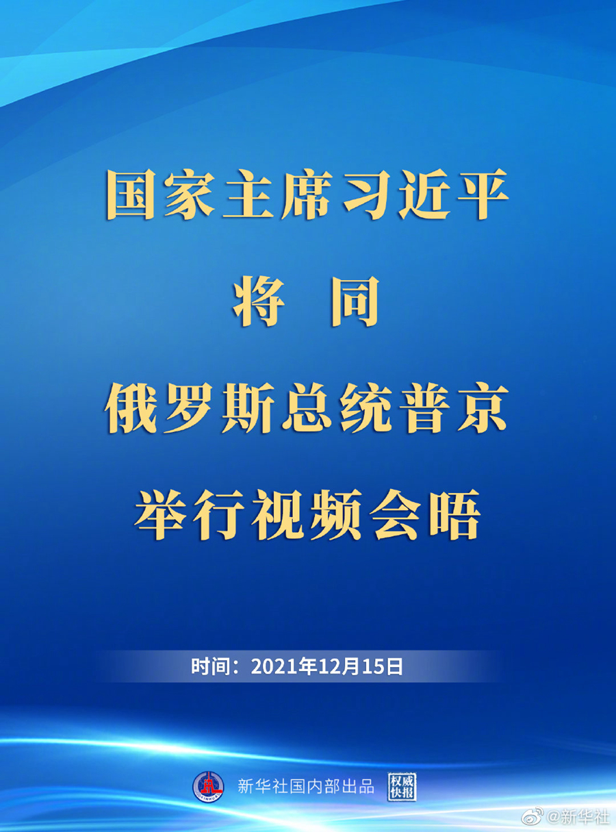 外交部发言人华春莹12月13日宣布:国家主席习近平将于12月15日在北京同俄罗斯联邦总统普京举行视频会晤。