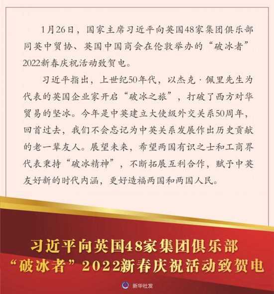 新华社北京1月26日电 1月26日,国家主席习近平向英国48家集团俱乐部同英中贸协、英国中国商会在伦敦举办的“破冰者”2022新春庆祝活动致贺电。