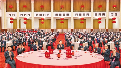 人民大会堂宴会厅张灯结彩、喜气洋洋,各界人士欢聚一堂、共迎佳节,现场洋溢着喜庆祥和的节日气氛。