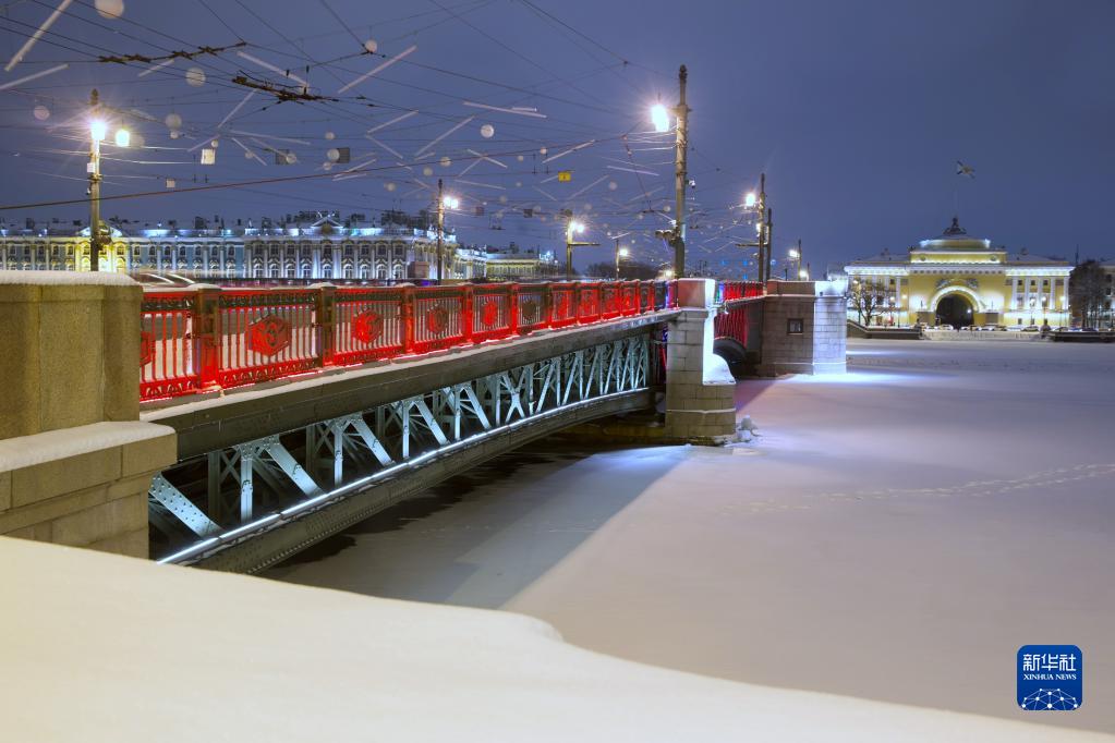 2022年1月31日傍晚,俄罗斯圣彼得堡地标性建筑冬宫桥亮起“中国红”,迎接中国农历虎年春节的到来。新华社发(莫京娜 摄)