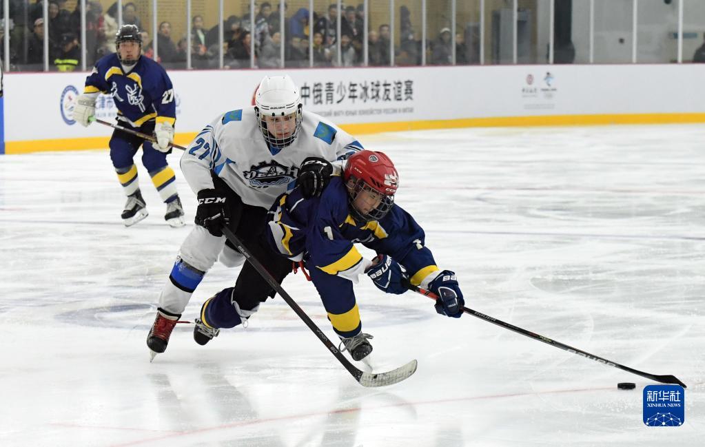 2019年12月10日,中俄双方队员在中国天津举行的第二届中俄青少年冰球友谊赛中拼抢。新华社记者马平摄