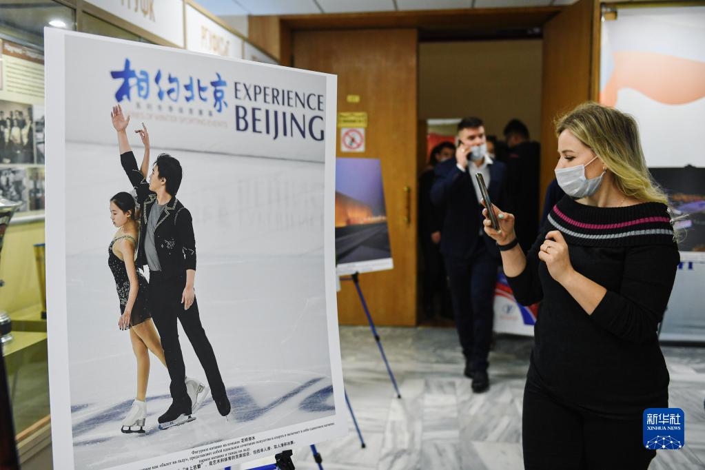 2022年1月21日,一名女子在俄罗斯莫斯科观看“北京冬奥会,一起向未来”冬奥图片展。新华社发(叶甫盖尼·西尼岑摄)