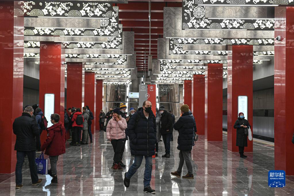 2021年12月7日,在俄罗斯首都莫斯科,乘客走在由中国铁建承建的莫斯科地铁第三换乘环线西南段米丘林大街站内。新华社发(叶甫盖尼·西尼岑摄)