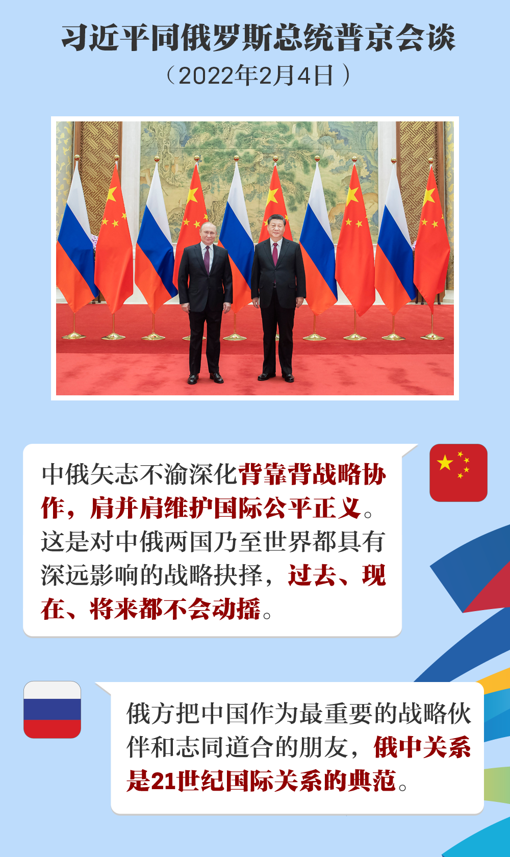 面对深刻复杂演变的国际形势,中俄矢志不渝深化背靠背战略协作,肩并肩维护国际公平正义。这是对中俄两国乃至世界都具有深远影响的战略抉择,过去、现在、将来都不会动摇。