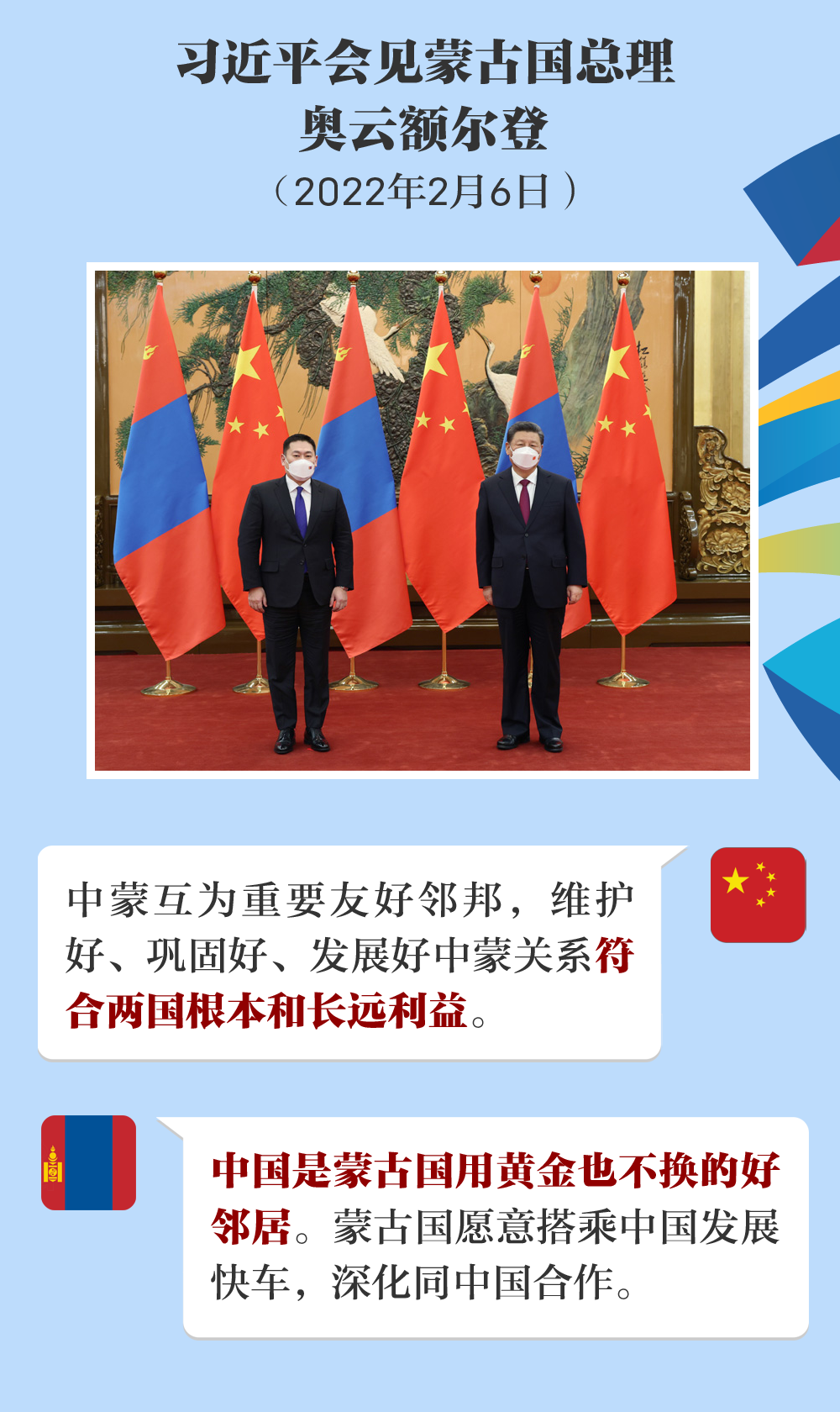 中方克服疫情困难如期举办北京冬奥会,给世界增添了战胜疫情的信心。“黄金难换好邻居”,中国就是蒙古国用黄金也不换的好邻居。中国的发展强大带动世界更加重视亚洲的价值文化。蒙古国愿意搭乘中国发展快车,深化同中国合作,使蒙中关系成为邻国交往和国际关系的典范。