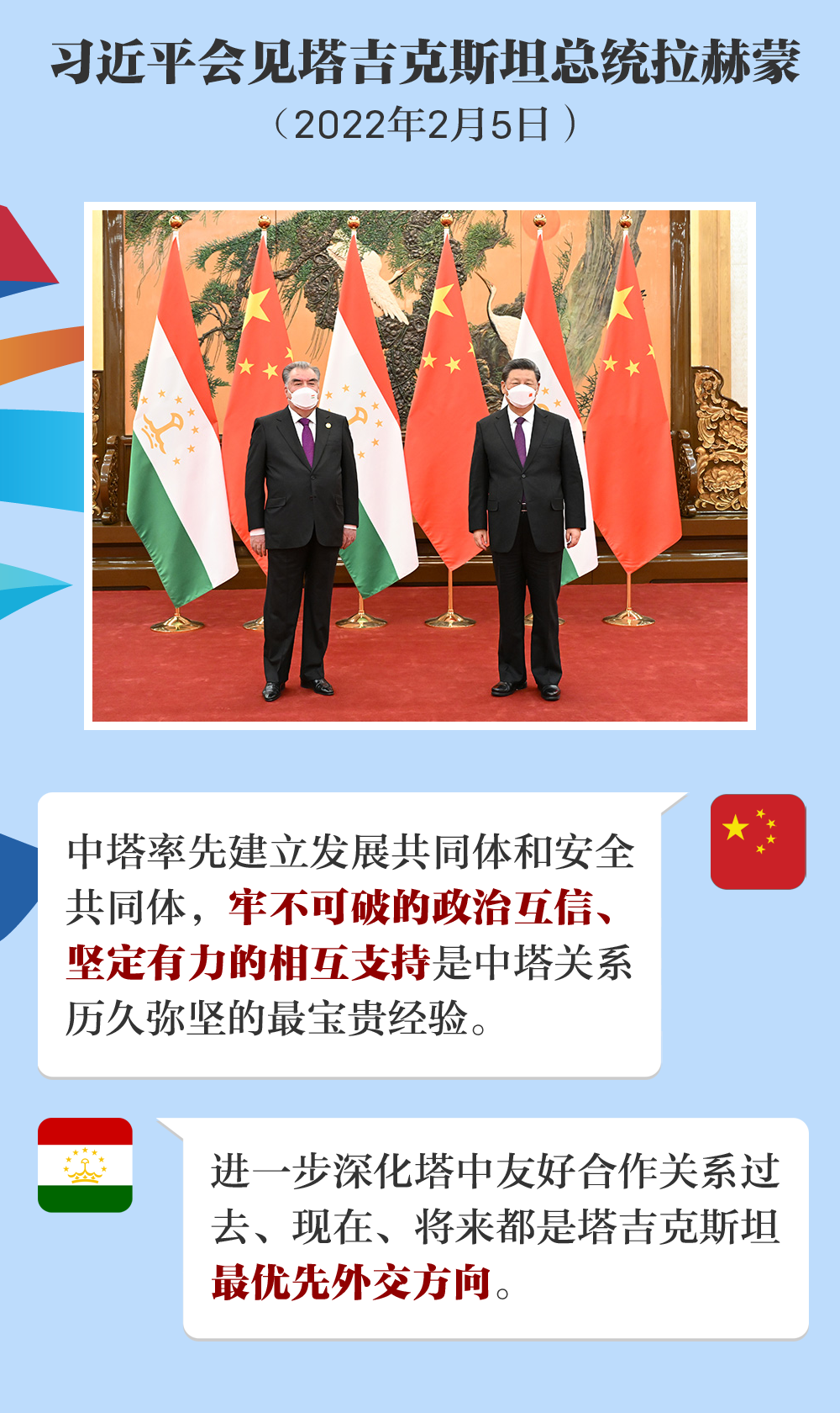 双方率先建立发展共同体和安全共同体,是名符其实的铁杆朋友。牢不可破的政治互信、坚定有力的相互支持是中塔关系历久弥坚的最宝贵经验。