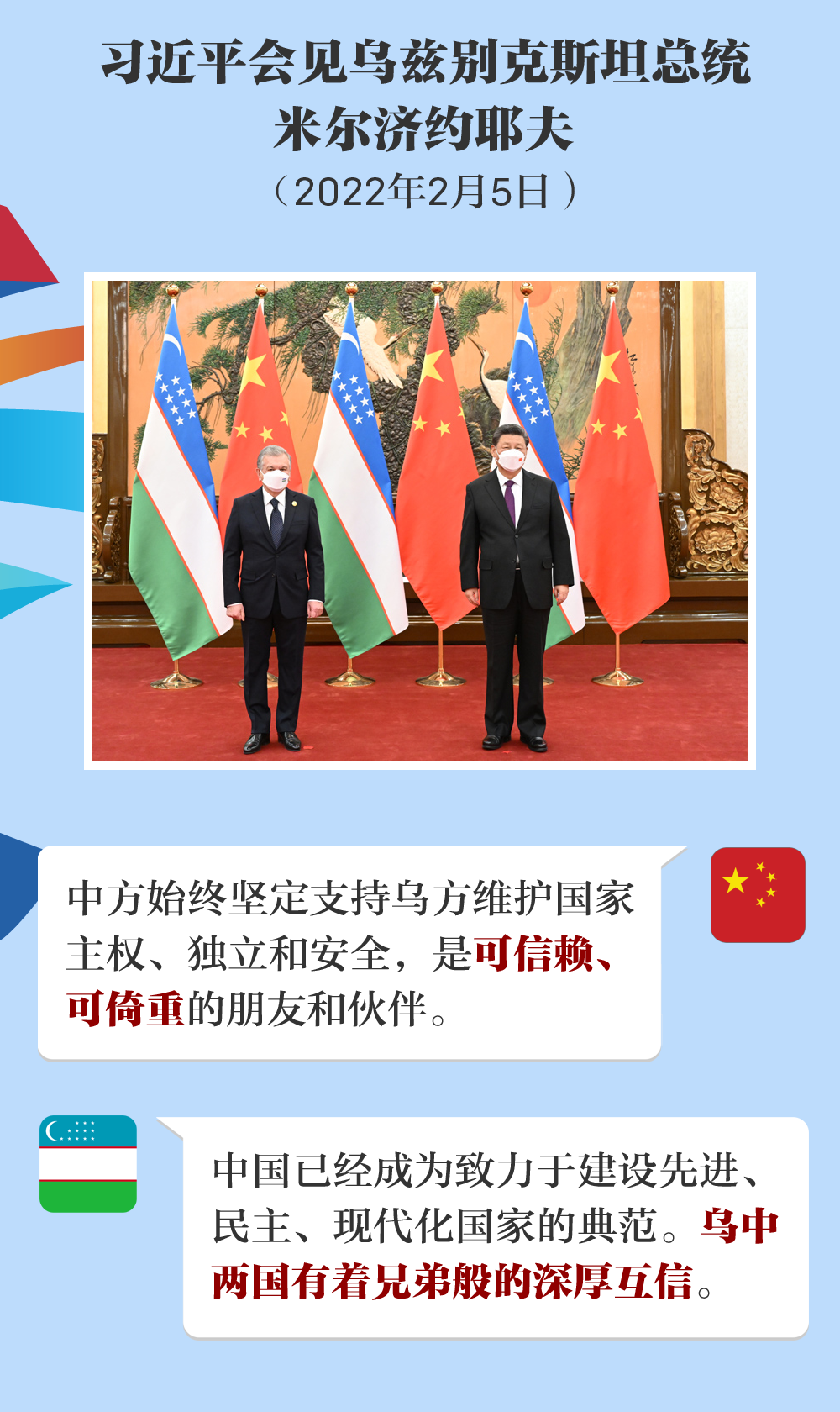 中方始终坚定支持乌方维护国家主权、独立和安全,是乌兹别克斯坦可信赖、可倚重的朋友和伙伴。中方愿同乌方在国家发展振兴的道路上携手同行,互帮互助。