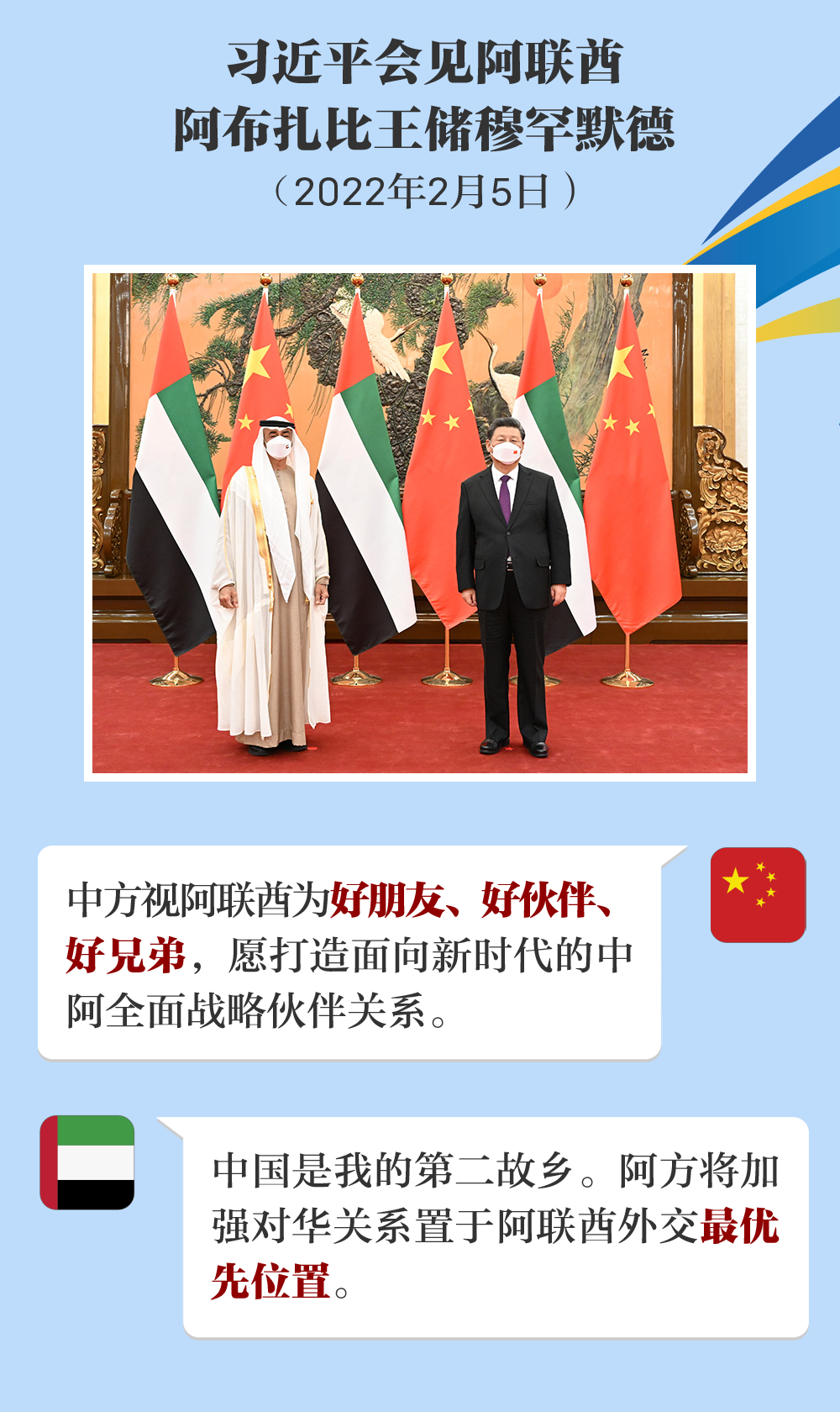 中方视阿联酋为好朋友、好伙伴、好兄弟,愿同阿方一道,把握两国友好大方向,打造面向新时代的中阿全面战略伙伴关系。