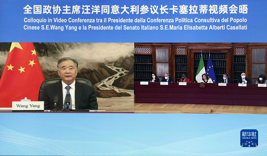 新华社北京4月12日电(记者伍岳)全国政协主席汪洋12日在北京以视频方式会见意大利参议长卡塞拉蒂。