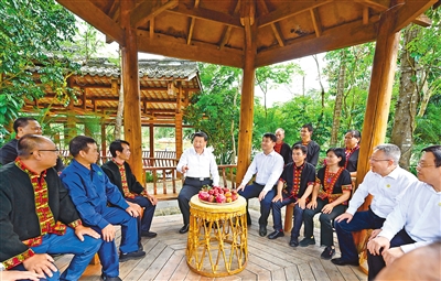 4月10日至13日,习近平在海南省委书记沈晓明、省长冯飞陪同下,先后来到三亚、五指山、儋州等地,深入科研单位、国家公园、黎族村寨、港口码头等进行调研。