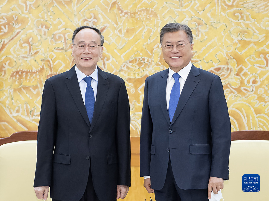5月9日,赴韩国出席韩新任总统尹锡悦就职仪式的习近平主席特别代表、国家副主席王岐山在首尔会见韩国总统文在寅。新华社记者 李涛 摄