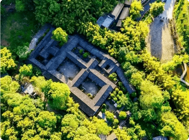 俯瞰贺麟故居,传统川西建筑格局,四周绿意盎然