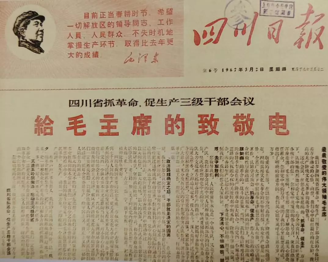 1967年3月,刊登于《四川日报》的抓革命、促生产会议给毛主席的致敬电(图片来源:《20世纪四川全纪录》)