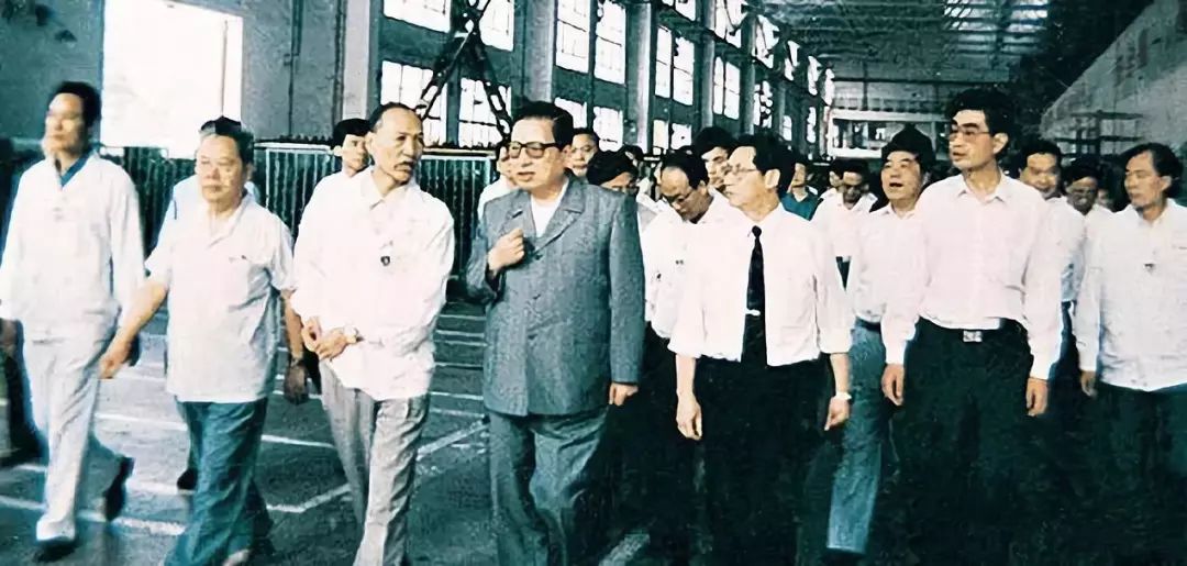 1993年6月,时任全国人大常委会委员长乔石(前排左四)在重庆视察嘉陵集团(图片来源:中国网)