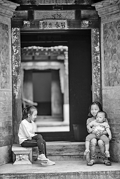 云南石屏县异龙镇符家营村儿童在村里的老屋门前休息。 新华社发