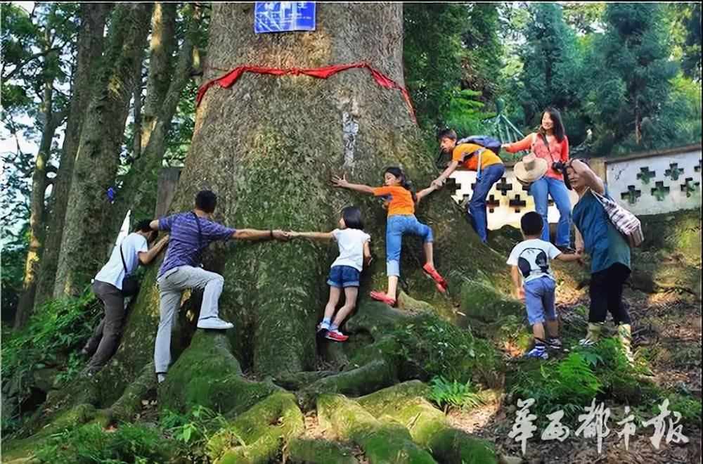 两位从成都来这里游玩的美女,在石梯上好奇地仰望那排古桢楠,她们小心翼翼走过地上盘根错节的树根,试图用手合抱其中的一株古桢楠树。当地人笑说,“就你们俩?再来七八个人才抱得拢。”