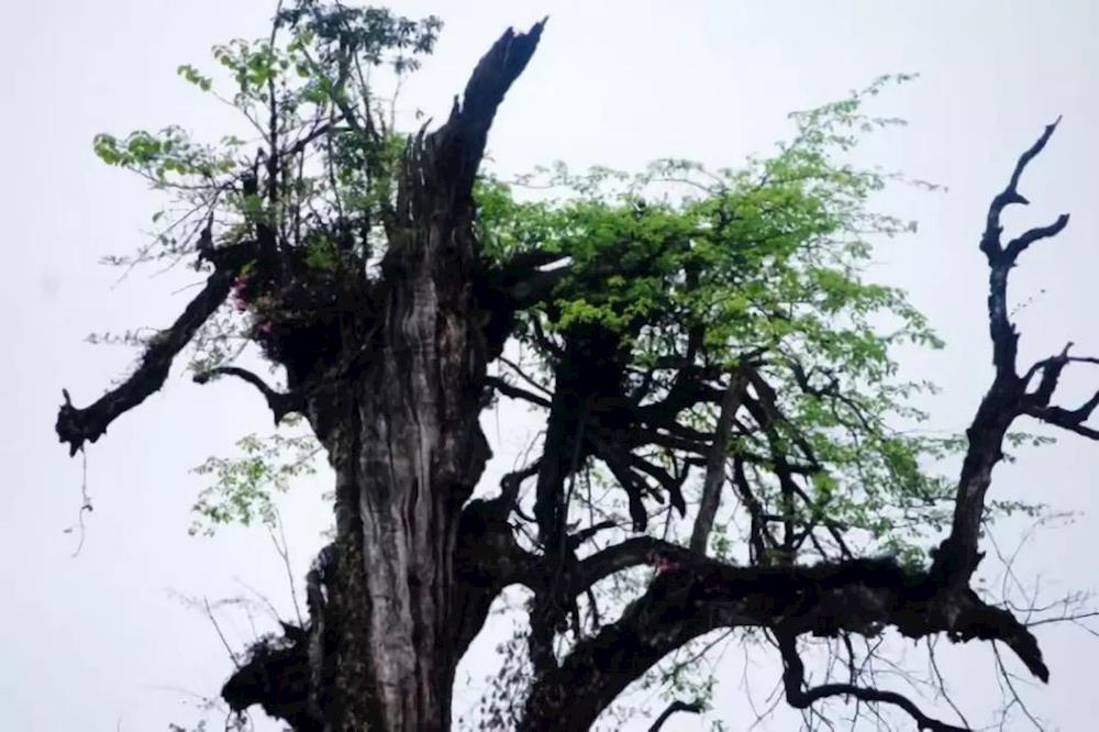 那两株奇特的桢楠树,远看是两棵大树,近看树干分开巨大的枝杈,一边光秃枯萎,一边枝繁叶茂。这两株桢楠树,一株高31米,一株高36米。