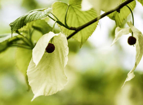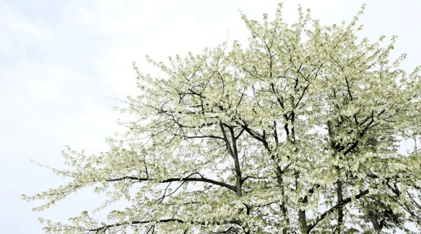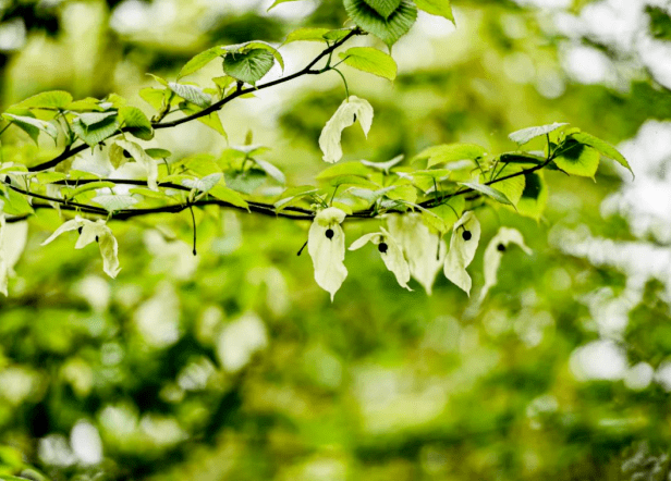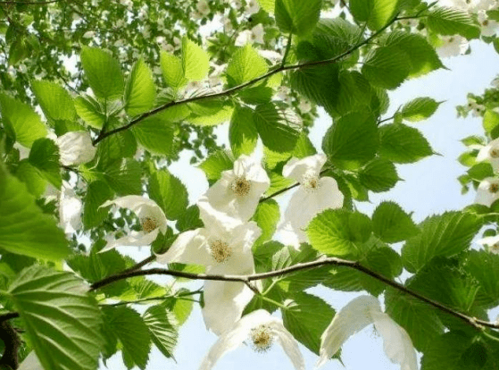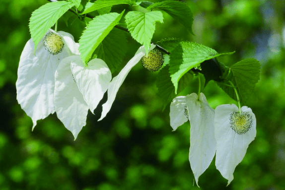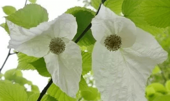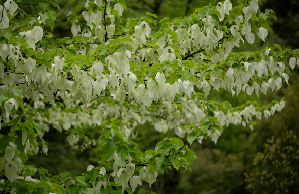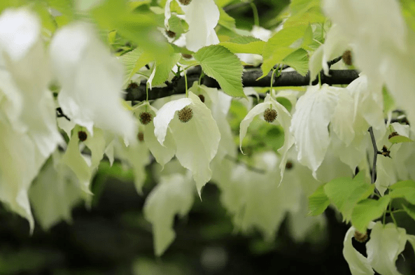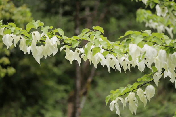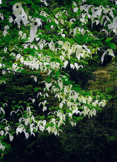 每年3月至5月开花时,在万绿丛中,珙桐像天使般展翅人间,犹如对对白鸽展翅,欣欣然欲飞出林涛绿海。