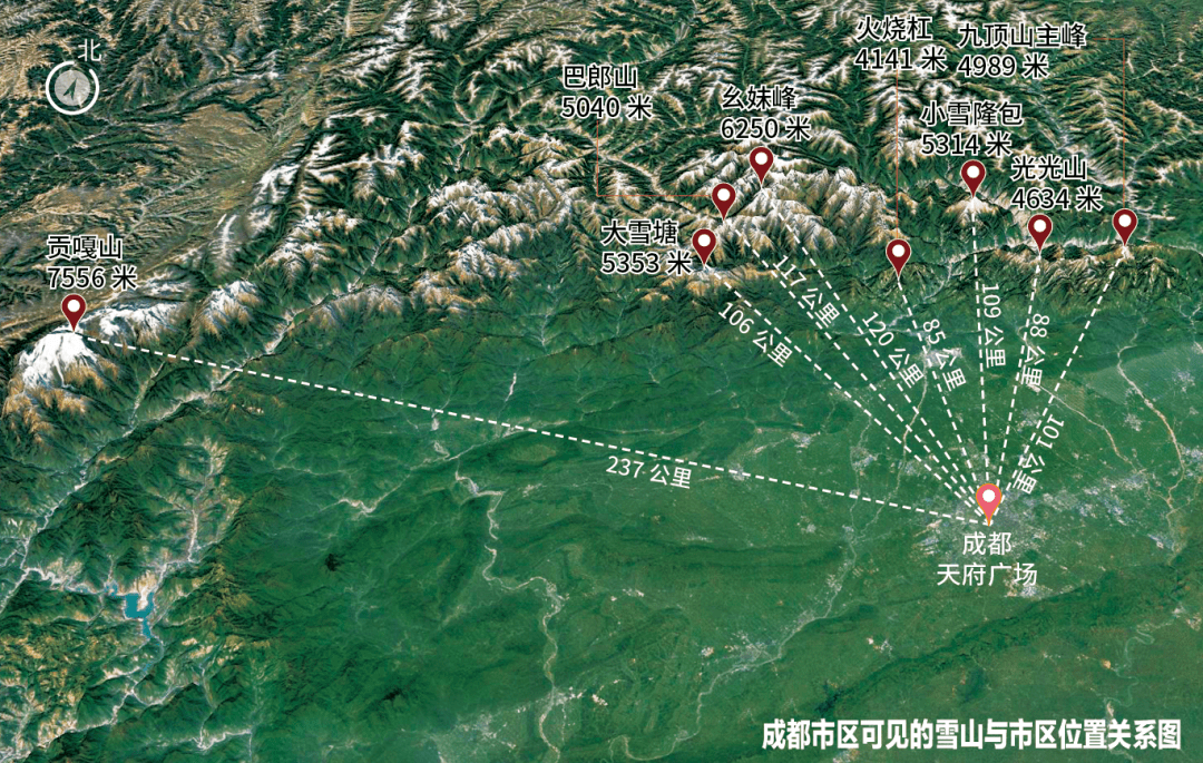 从海拔500米的成都平原西望,皑皑雪峰与城市楼群交相辉映,显得高大、奇崛。“窗含西岭千秋雪”,便是杜甫在成都观雪山的真实记录,也开了描述成都作为雪山下的城市的先河。