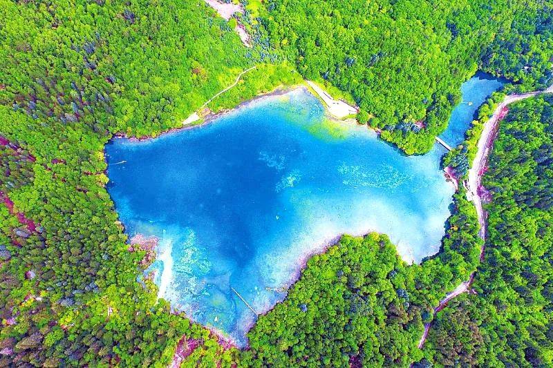从长海下来,便一眼能望见山腰密树丛中深藏着一枚巨大的蓝宝石,水域蔚蓝,蓝中带彩,再走近一看,方知赤橙黄绿深融其间,一阵清风掠过,池里水色又蓝中带紫,或青绿或粉蓝或金黄的五彩涟漪正一圈一圈静静地溅开。