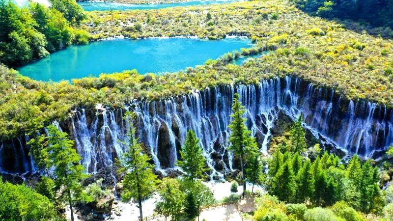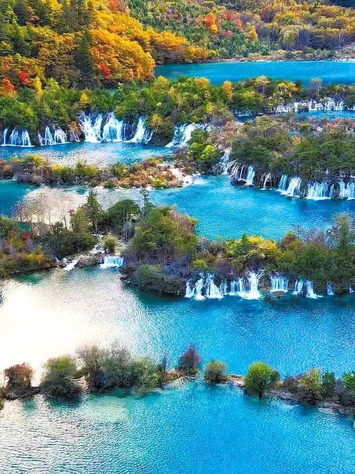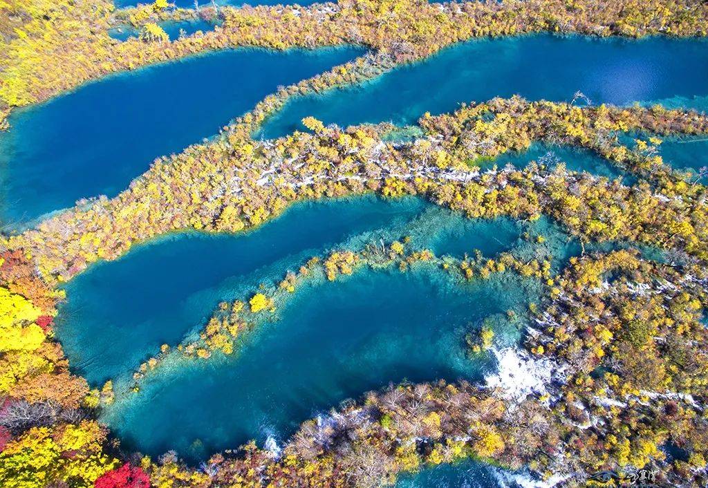 从树正瀑布再向下行走,便是层层错落的大小海子群,上下顺沟叠延五六公里远五彩的水光碧波荡漾,无数美景镶嵌两岸水流在潺潺低吟声中白浪翻卷。