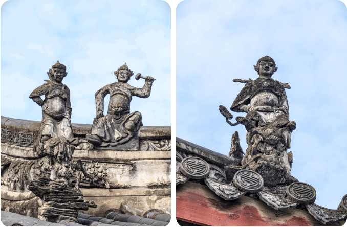 乐楼歇山顶盖小青瓦,滴水瓦当为狮子图案;屋顶正脊为砖雕双龙,四方歇山脊上均为各式辟邪怪兽,或蹲或立,八面威风,惟妙惟肖。其檐远出,斗拱宏大,颇具川西坝子古蜀干栏式建筑的风范。