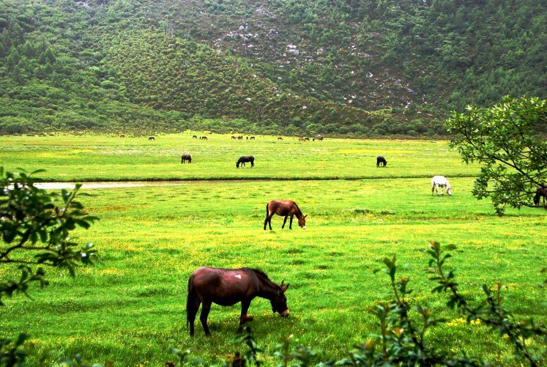 洛绒牛场如今已经被围护起来,并不作牧场之用。牛场的野草格外丰茂,像是用尽全力展示自己的绿意,却挡不住秋意悄然而来的侵蚀。天地万物,生生息息,因循了自然法则,也就遵从了季节变换的规律。