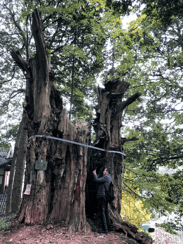 2020年11月,我和朋友踏上了探访这棵树的路程,在邛崃市兴福寺的后山坡上,我看到了这棵古树。它似一位饱经风霜的老人,深褐色的肌肤满是被岁月刻画的深深皱纹,粗大的树干外围足有10米,要七八个人才能围抱,里面已经空空如也。主干上箍着一圈钢圈,还有一根粗大的钢管支撑着,边上还砌有一堵砖墙保护。
