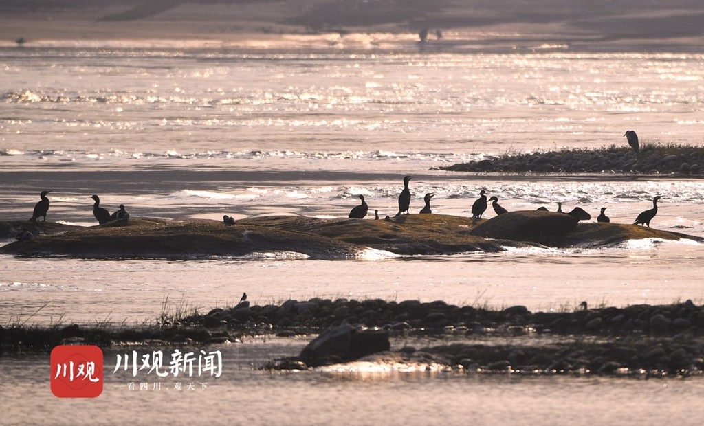 11月18日,泸州市江阳区邻玉街道漕溪村长江边上,鸬鹚、白鹭、苍鹭、绿头鸭等在江边滩涂地漫步,鸟儿们时而游弋,时而飞翔,入川过冬的鸟类纷纷在这里聚集。